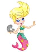 As a mermaid, Polly's ponytail is held together with an orange scrunchie, and her bangs sweep towards her right side. She wears a sandy green bikini top and a matching cover-up with mint-colored polka dots. As a mermaid, her tail is deep purple with three pink flowers, with the fourth one in a random position on her top. When she goes underwater, her tail turns pink, and her flowers turn yellow.